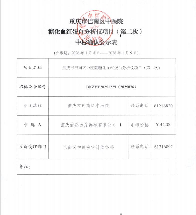 糖化血红蛋白分析仪项目(第二次)中标确认公示表