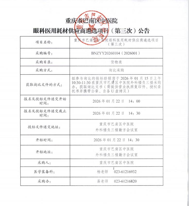 眼科医用耗材供应商遴选项目(第三次)公告