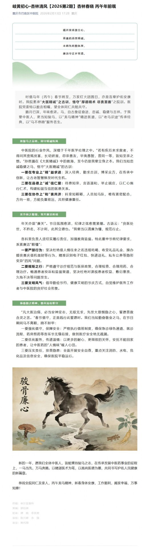 岐黄初心·杏林清风【2026第2期】杏林春晓 丙午年前嘱