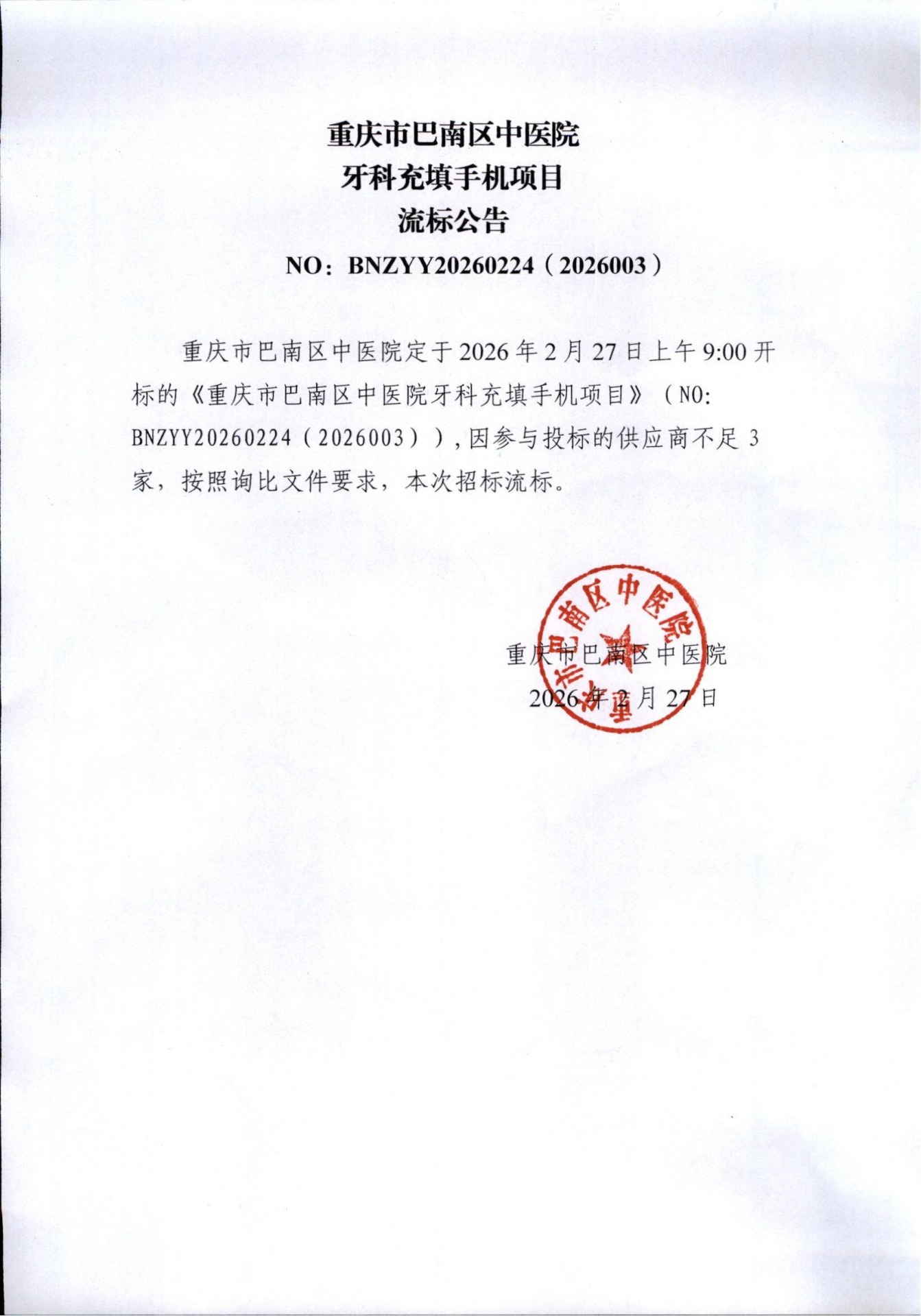 牙科充填手机项目流标公告