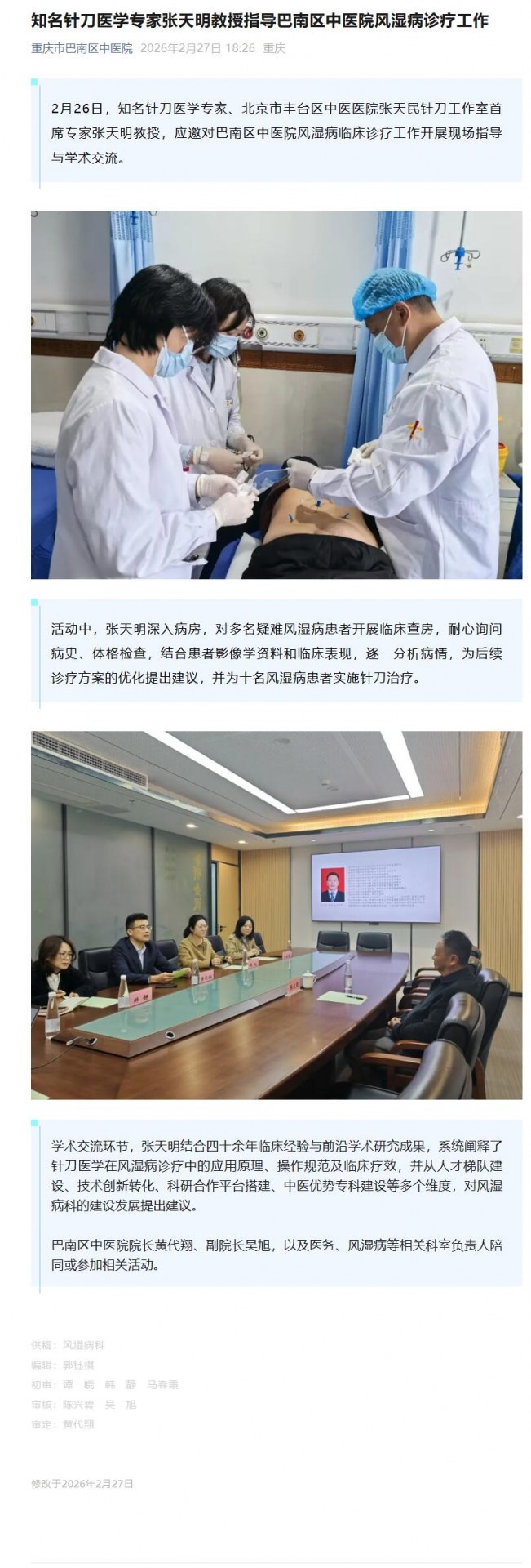 知名针刀医学专家张天明教授指导巴南区中医院风湿病诊疗工作