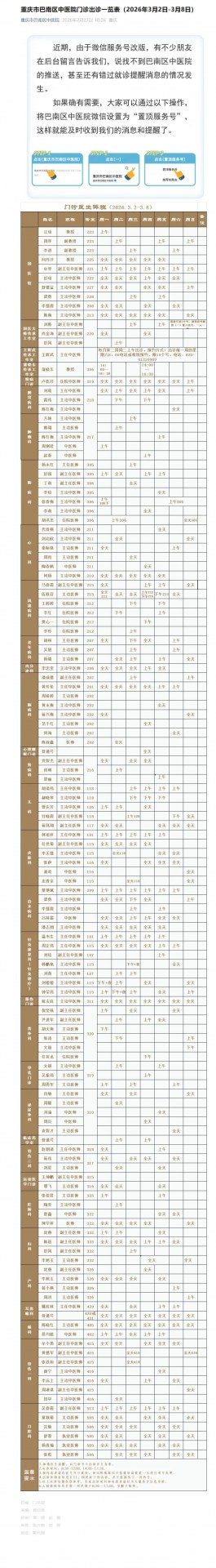 重庆市巴南区中医院门诊出诊一览表(2026年3月2日-3月8日)