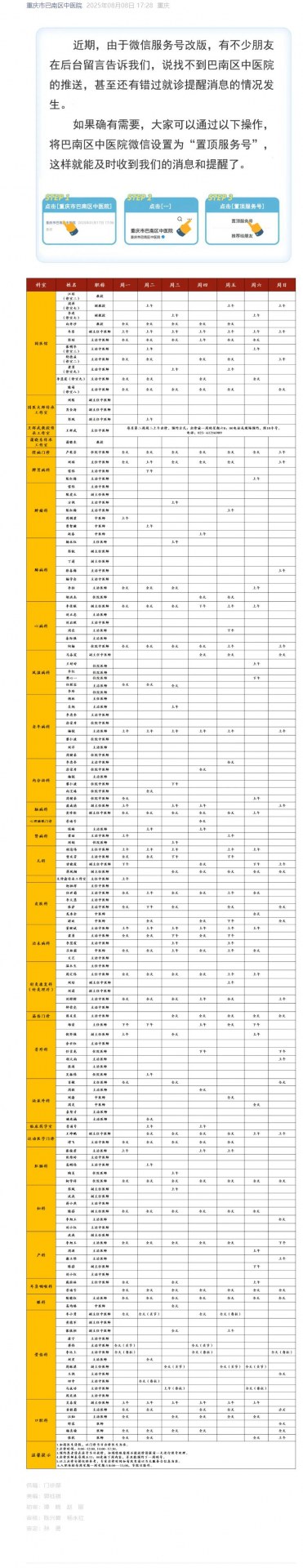重庆市巴南区中医院门诊出诊一览表(2025年8月11日-8月17日)