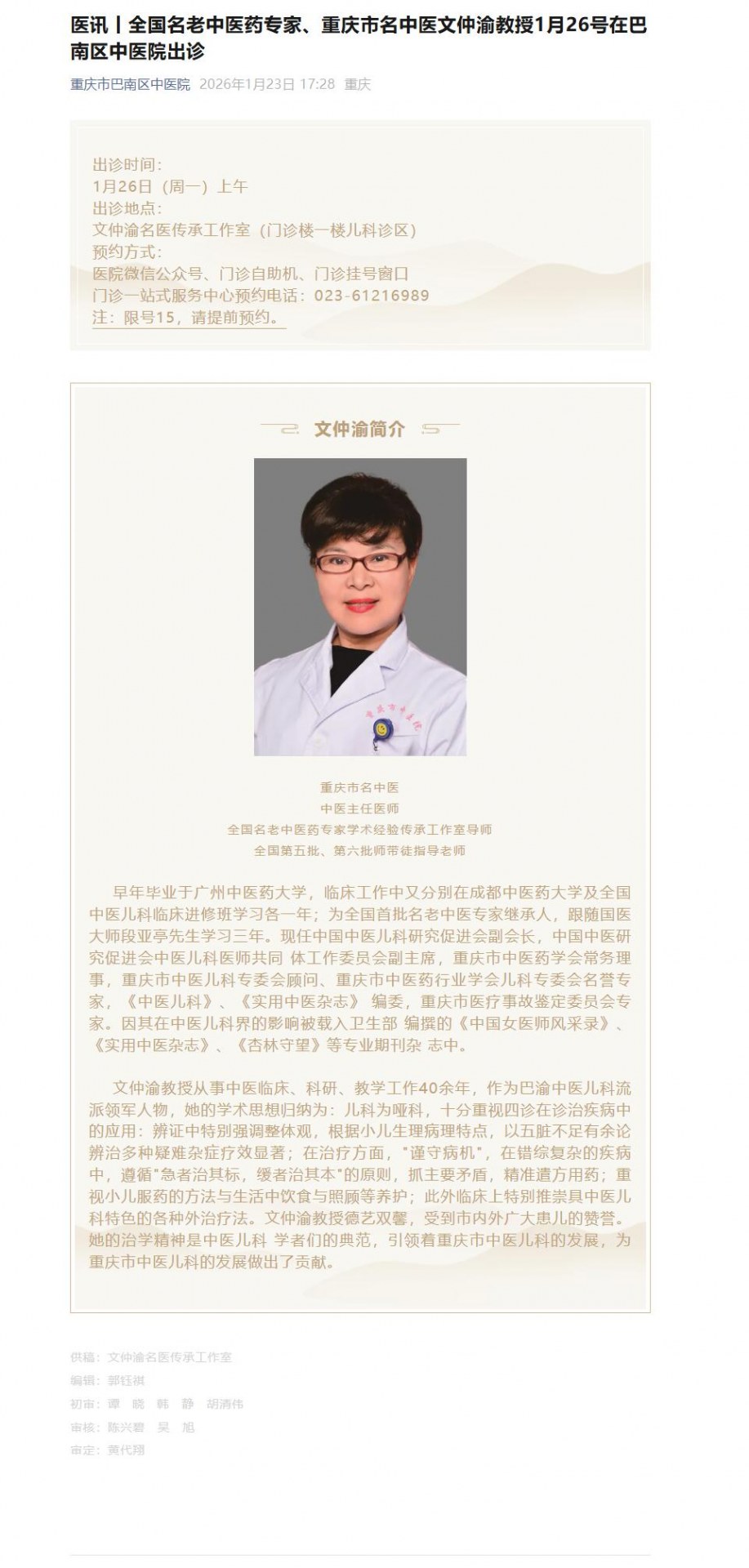 医讯丨全国名老中医药专家、重庆市名中医文仲渝教授1月26号在巴南区中医院出诊
