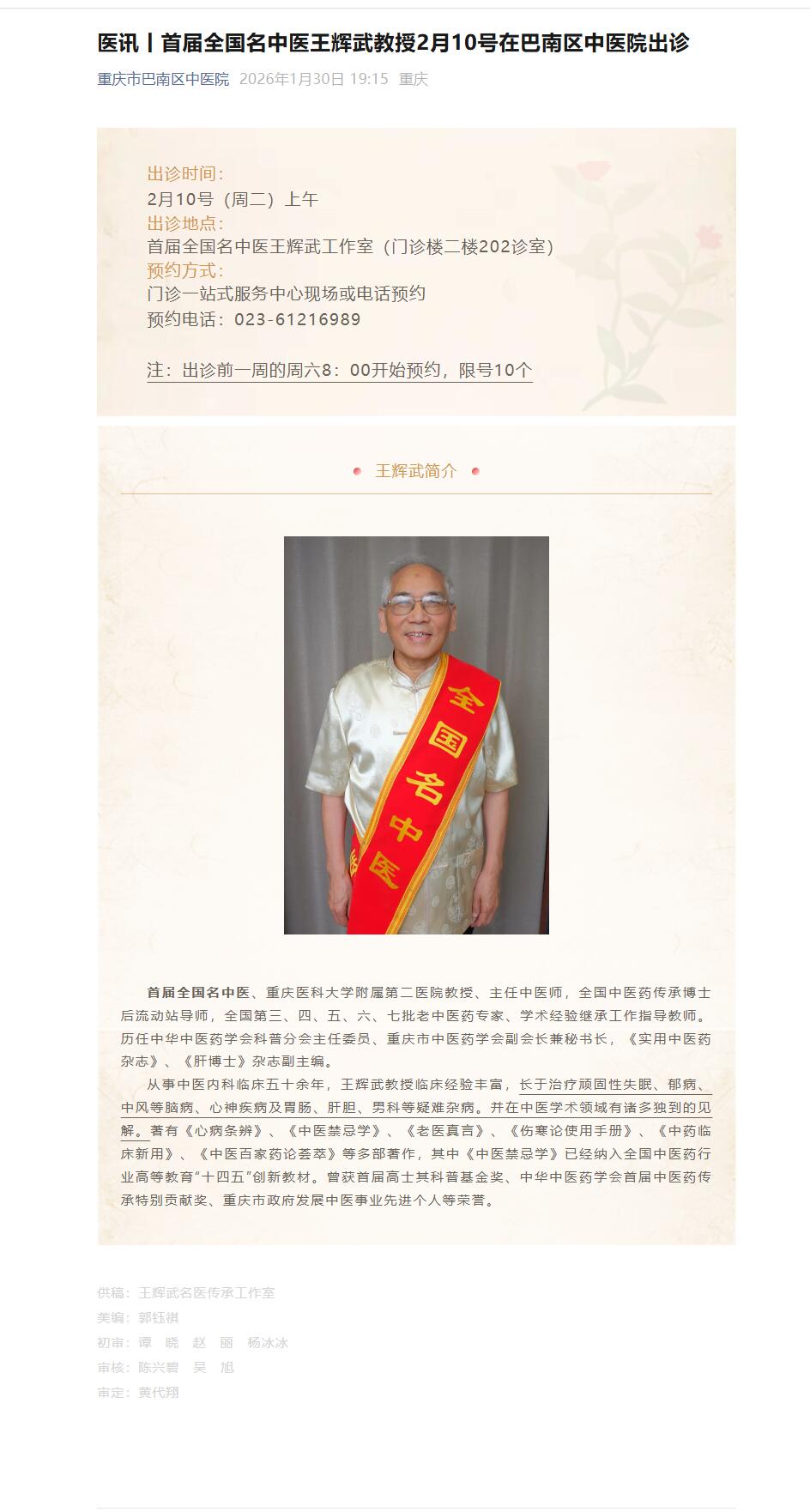 医讯丨首届全国名中医王辉武教授2月10号在巴南区中医院出诊