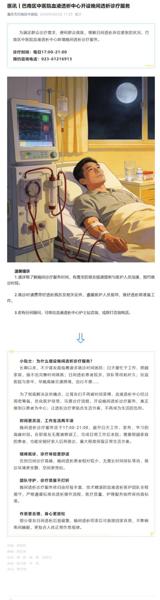 医讯丨巴南区中医院血液透析中心开设晚间透析诊疗服务