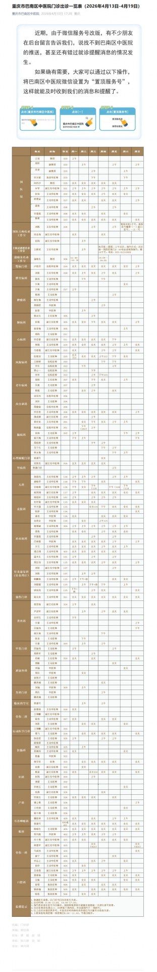 重庆市巴南区中医院门诊出诊一览表(2026年4月13日-4月19日)