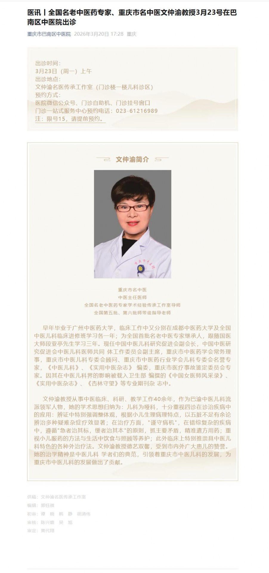 医讯丨全国名老中医药专家、重庆市名中医文仲渝教授3月23号在巴南区中医院出诊